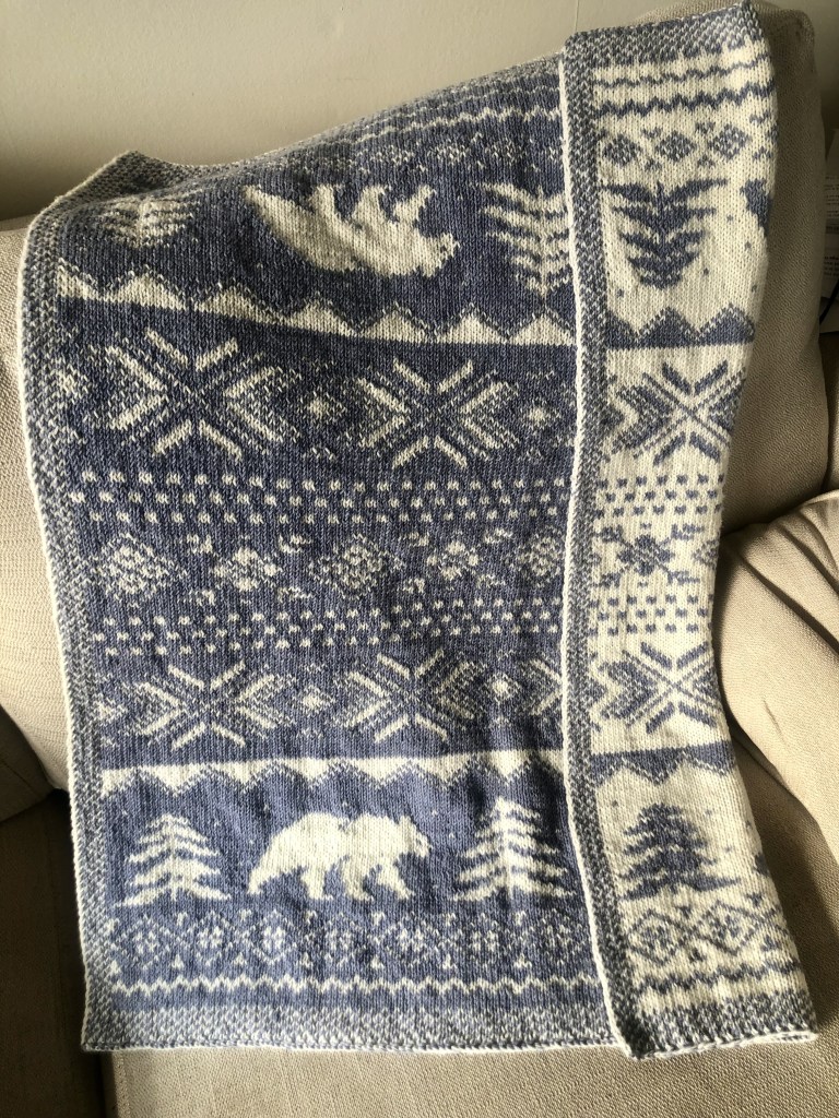 Like most of my knitting, a project captures my interest when it changes. I have learned that I prefer pictures to graphic designs. At the same time, graphic designs serve as a wonderful frame for the pictures. Too much of either spoils the impact. I’ve been knitting a simple summer linen sweater to bring on a vacation to a hot country. It’s taken me longer to knit this sweater than it took to make the green and grey elk blanket. The plain stitching on the body has been sending me around the bend.