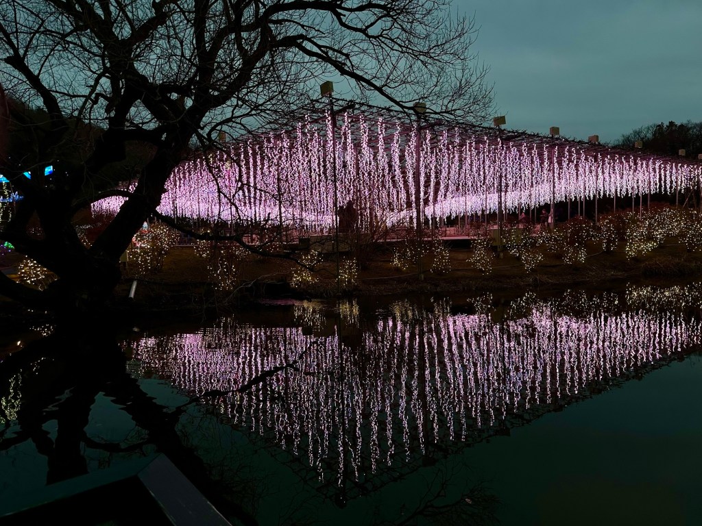 The gardens are most famous for the wisteria. In season, this entire block is a single plant. In winter, it’s lit up as though it were in bloom. The colours change, by the way.