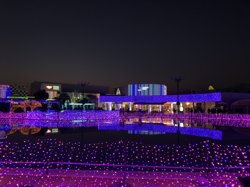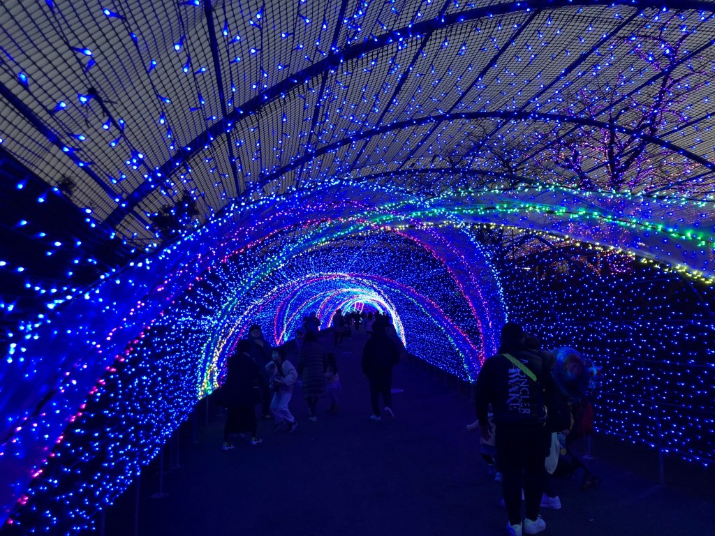 It was almost dusk, so we went on the giant Ferris wheel to get our first look at the illuminations. Back home, we call them Christmas lights. The park sparkled. In some areas, it twinkled. We walked through a very long light tunnel, and got confused when the lights went out. It was the start of some choreography the lasted the remainder of walk. The tunnel was mostly blue, with criss-crossed ribbons of colour, and during the choreography different patterns of light would go on.