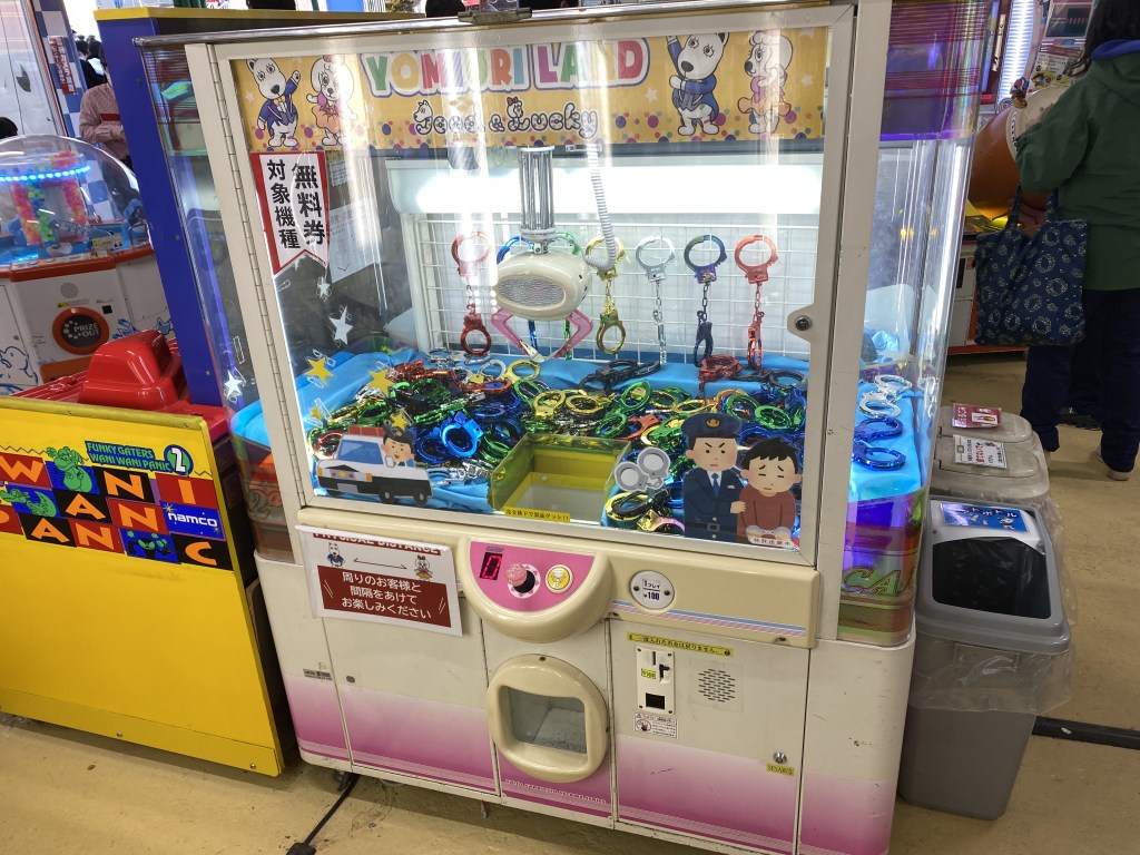 Many places we went, we saw capsule machines — for 100 or 500 Yen, you can take your chances and get a three inch sphere with something in it. In Yomiuriland, there was a pavilion with claw machines. For a reasonable price, you can test your dexterity and pick up something interesting. In this pavilion, there were two machines that gave you a chance to win handcuffs!