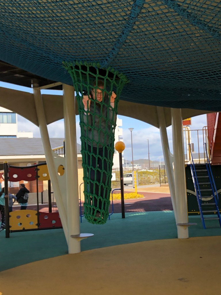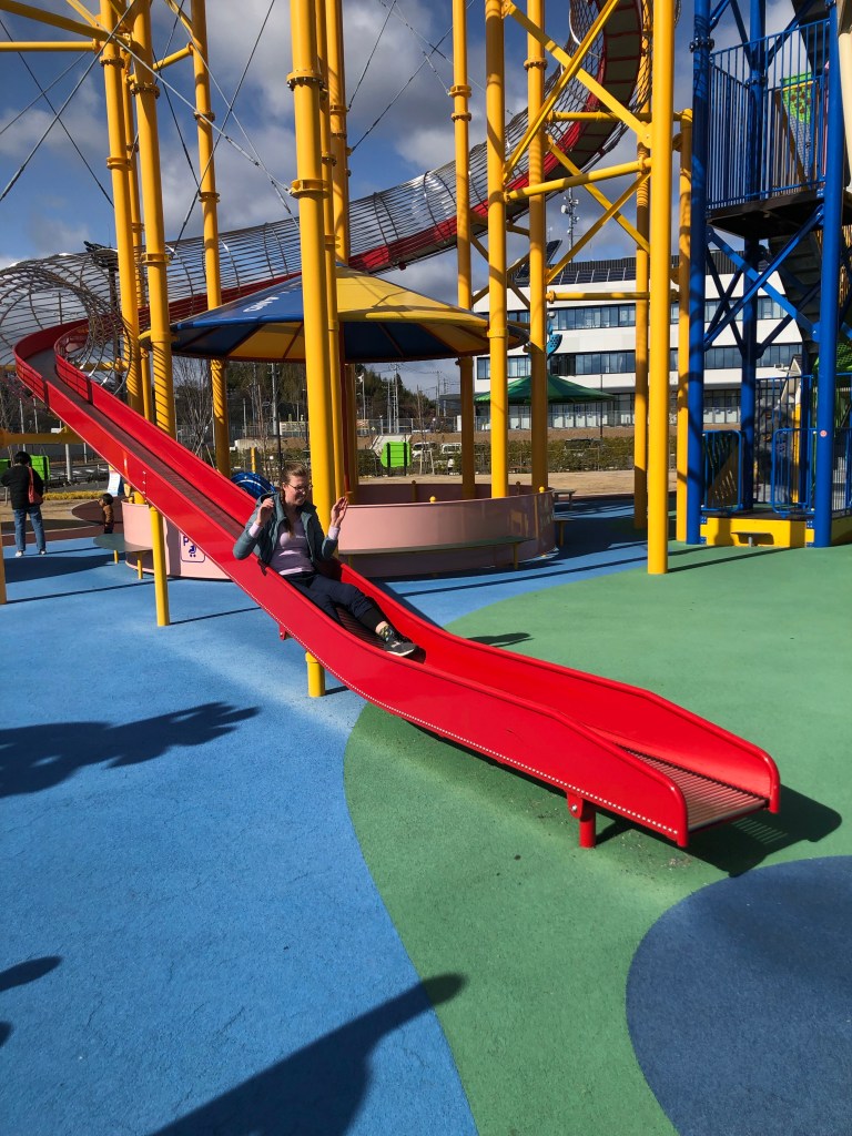 The middle layer was a bouncy ellipse. There was another rope net layer, and then a final set of stairs to get to the start of the long spiral roller slide. For the wee ones, there is a small roller slide. From what we could see, it just whet the appetite for grander slides.