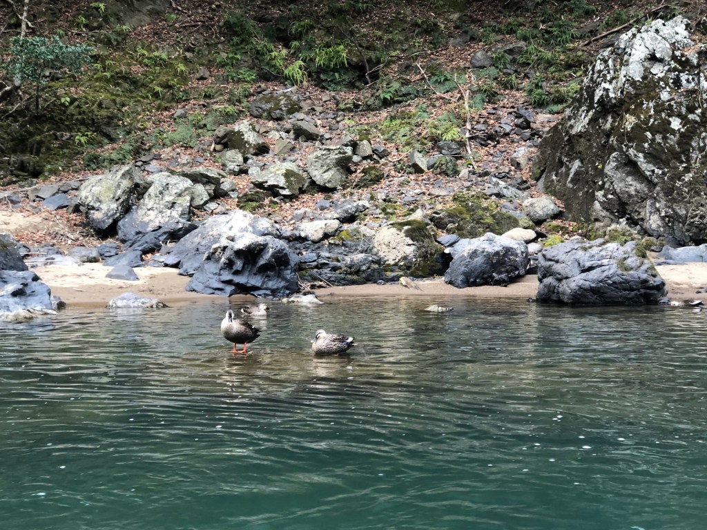 In the Spring and Fall the route must be spectacular. Cherry trees line the banks in several spots. In the heart of winter, we saw a heron, several cormorants and a variety of ducks. I’m not an expert, though I’m pretty sure we saw some sandpipers and some wee birds that were either finches or canaries. Near the end, some monkeys followed our path along the tree line of the port shore.