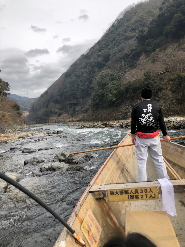 We started just a short walk from the Kameoka Station, having taken the local train from Kyoto. The tour started in 1896, though I don’t think they have used fibreglass boats since the beginning. The boat was canoe-like — long and thin with padded benches to sit on. We had three crew and 10 guests. There was a Japanese woman in front of us with two 20ish Australian girls. She translated a lot for them, and included us in the commentary.