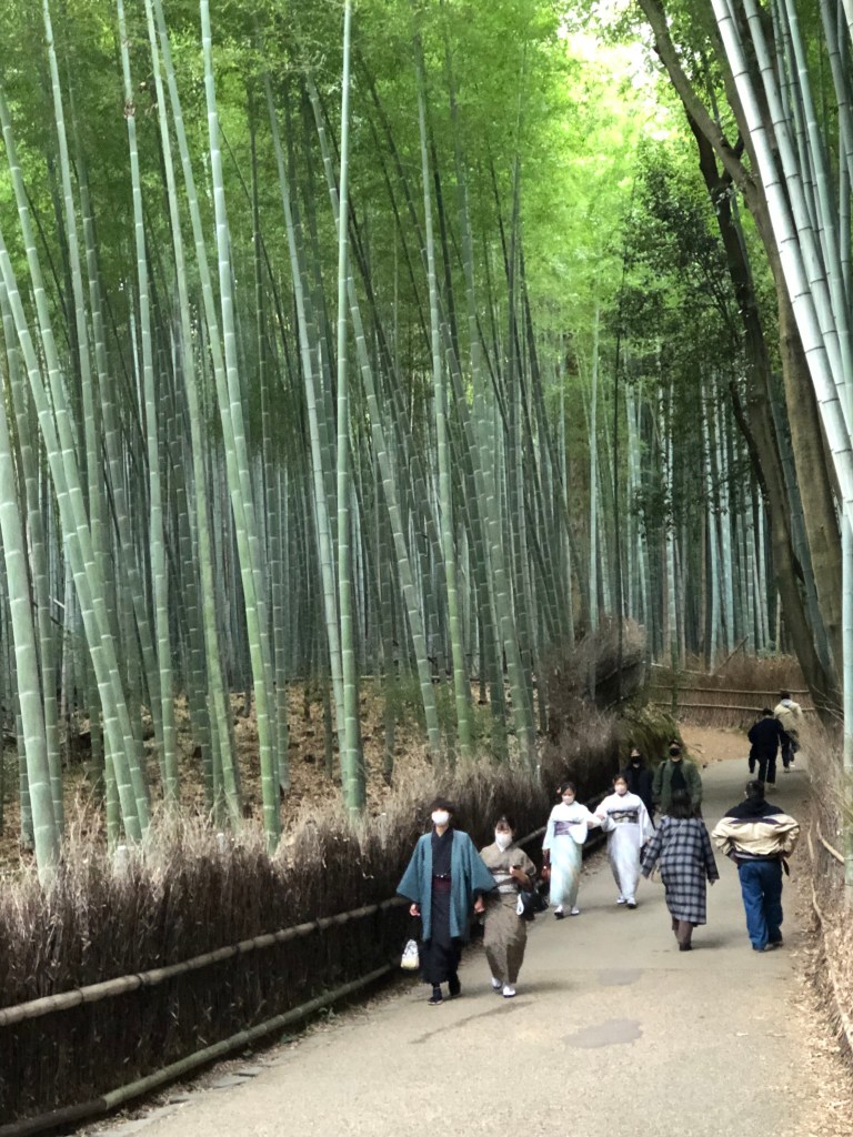 A few blocks down the road is the bamboo forest, which seems to be the main attraction. It was enjoyed by visitors from Japan and abroad. I was surprised to see many Japanese visitors in traditional dress. The bamboo in the forest is a very tall variety, with some stalks green and others greyed by age.