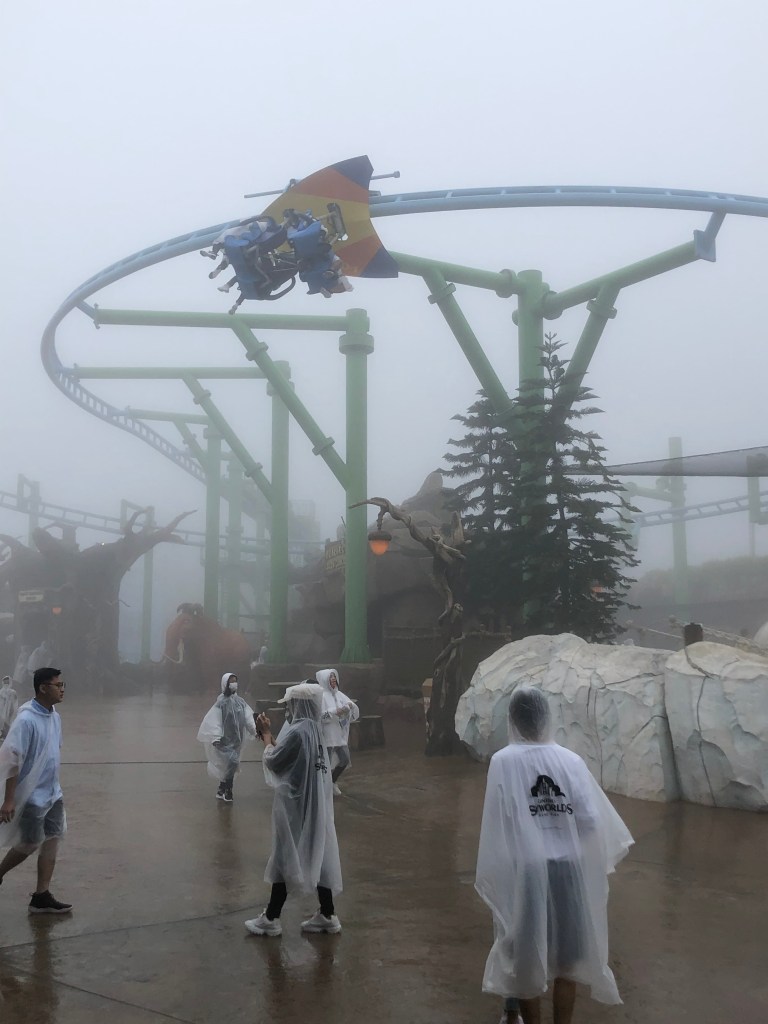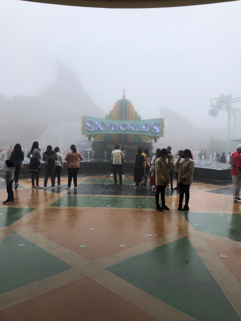 Today we visited our sixth theme park — Skyworlds in Genting Highlands, just north of Kuala Lumpur. It’s still in its soft opening phase so that it can work out the kinks. One of the kinks was weather. Skyworlds is high up (elevation 6,000 feet), and we spent the day either in the clouds or in the rain.