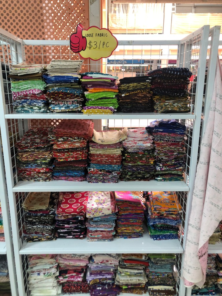 Since we made a pilgrimage to Nippon Fabric Town in Tokyo, it seemed fair to visit the fabric stalls of People’s Park in Singapore. There are more cottons, linens and lightweight fabrics than anything else. Understandable since Singapore is almost on the equator.
