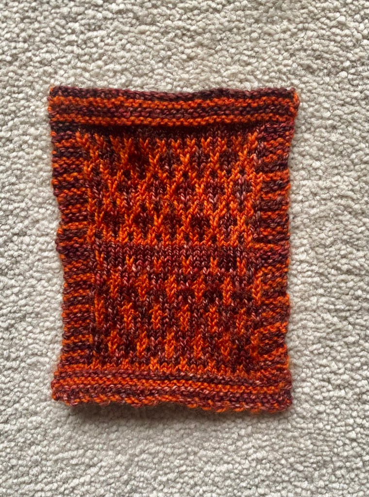 It’s the same with the mosaic swatch. The yarn is the same, the needles are the same, the pattern is the same, yet the top and bottom look different. Swatching gave me an idea of how the colours act together.