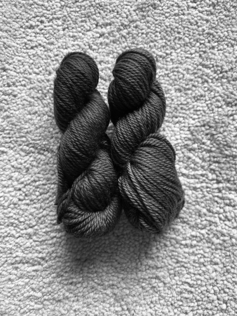 An undeniable rule of colour work is that you must have yarns that have contrast. I have learned that I can’t trust my eye to identify contrast. I will see ball A and ball B as having contrast because they are different colours. However, when a single strand of ball A is wrapped with a single strand of ball B, the colours might meld and the contrast disappears. For this reason, I always take a black and white picture of my chosen yarns.
