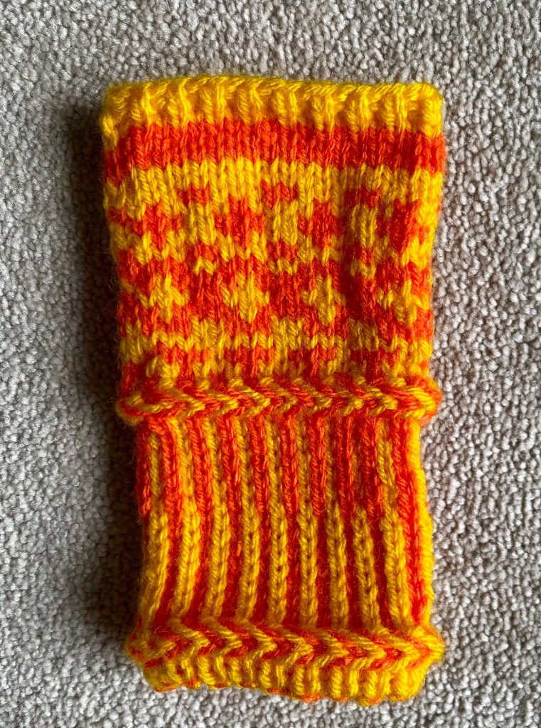 I often use this yellow and orange combination of colours in teaching. It’s easy to see what’s going on, and it’s easy to see when you’ve gone wrong. I might use this colour combination for a pair of mittens that I’m likely to misplace — it’s easy to spot from a distance.