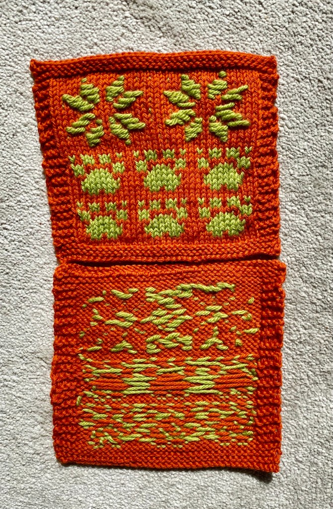 When stranded knitting, I am carrying a yarn behind my work. When I pick it up to use it, I try to keep the float (the unused yarn behind) at the same tension as the front — I try to pull it so that it covers the same distance as the worked yarn on the surface. In the orange and green sample above, the paws are stranded colour work and the stars are inlay. The top swatch is the front side, and the bottom swatch is the backside. In the middle, section of the bottom swatch, you can see how the unused yarn floats across the work.