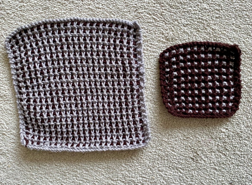 As I was exploring colour dominance, I was surprised by the way colours expressed their dominance in mosaic knitting. The slipped colour is more dominant in the trivets. That was not the case in the orange and brown swatch far above. This is a very good reason to swatch before committing yourself to a project that is larger than a coaster.