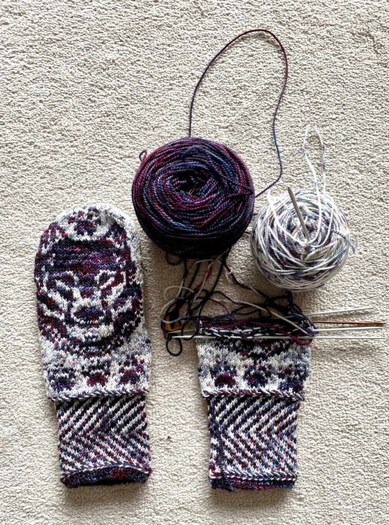 Sometimes, I learn the hard way. One such lesson was a pair of Elkhound Jämthund Mittens by Connie H Design. I knit the first pair in solids. They were great. For the second pair, I selected some yarns with similar speckles. Big mistake. The speckles sometimes got in the way of the detail.