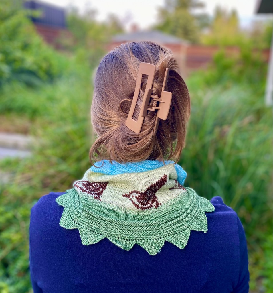 This pair of fingerless mittens took two purple skeins and less than one blue skein. The colour work is simple stripes because I wanted it to be reproducible. The bottom edge is scalloped because I like this edge, and it adds interest. In the cuff, the stockinette between the ridges is purple, and peeks out when you bend your wrist. The eyelet band at the top of the wrist also adds interest. It’s an easy quick knit that looks impressive and doesn’t take a lot of time.